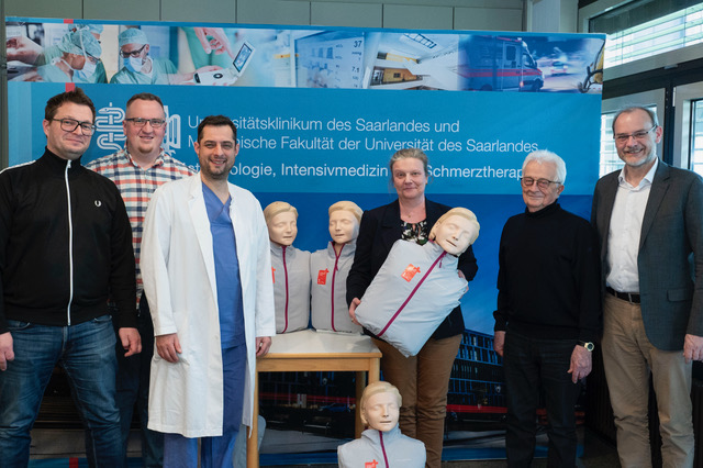 Denn im Falle eines Herz-Kreislaufstillstandes zählt jede Minute. „Umso wichtiger ist es, dass insbesondere die Mitarbeitenden in den Kliniken in der Durchführung von Reanimationsmaßnahmen geschult sind, damit diese schnell und sicher angewendet werden können“, erläuterte Dr. Werner Armbruster, Oberarzt der anästhesiologischen Klinik und Leiter des Bereichs Notfallmedizin. Die Anästhesiologie am UKS organisiert seit vielen Jahren große Teile des notfallmedizinischen Aus- und Fortbildungsangebots auf dem Campus. „Wir möchten, allen Mitarbeiterinnen und Mitarbeitern eine hohe Handlungskompetenz zur Durchführung einer Herz-Lungen-Wiederbelebung vermitteln.“ Mit diesen modernen Puppen kann das Schulungsangebot nochmals verbessert und intensiviert werden.
